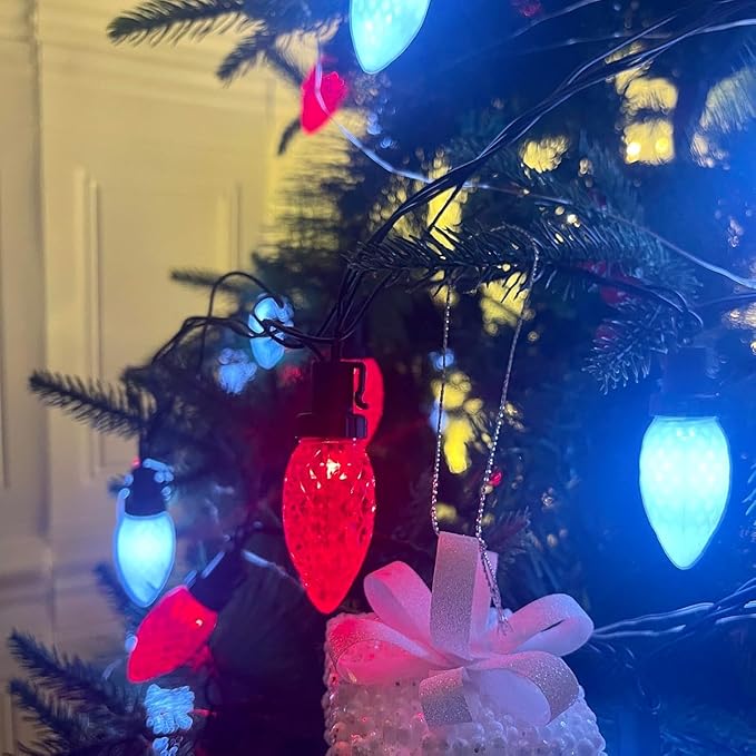 - 2 Pack Red and White C9 Christmas Lights: This LED String lights is made with durable green wire and C9 LED bulbs; It is a great holiday decoration; Each set contains 2pcs of String lights, each piece size: 10 FT leading wire + 33FT string lights of 50 LED bulbs; 2pcs total 100 LED bulbs 66ft