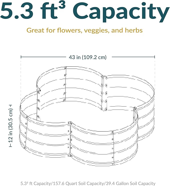 - GROW BEAUTIFUL PLANTS AND FLOWERS: This galvanized metal garden bed measures 43" W x 43" D x 12" H and weighs 9.2 lbs. It has a soil capacity of 39.4 gal (5.27 cu ft).