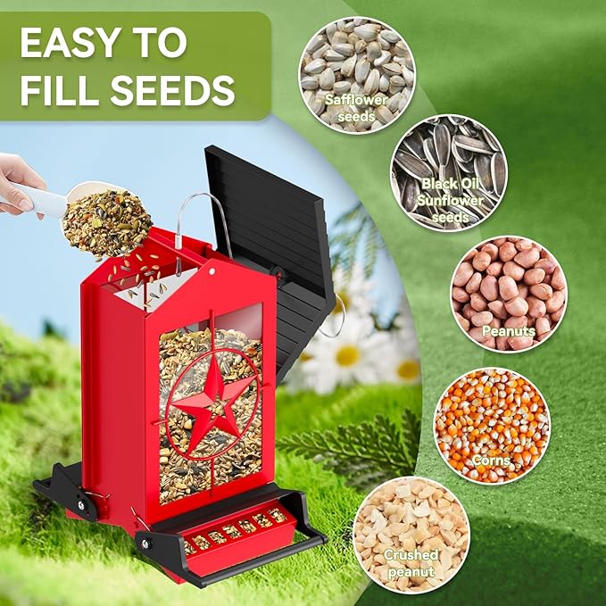 • Easy to Refill and Clean: The detachable roof and large opening make this bird feeder squirrel proof easy to fill with seeds, and the transparent window also allows you to monitor whether the seeds are sufficient at any time. here are also drainage holes at the bottom of the outdoor bird feeders to keep the seeds dry and ventilated. Cleaning is also very simple, just remove the cover and rinse with water directly!