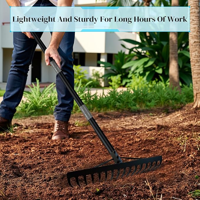 - Versatile Design: With its wide, curved tines, this rake is perfect for a variety of tasks, including soil preparation, debris removal, and lawn maintenance, offering exceptional versatility for all your gardening needs.