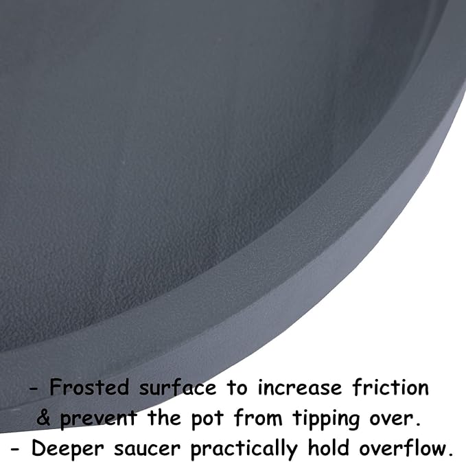 - [Non-slip & Easy to Clean Surface]: The surface of the tray is frosted to increase friction with the bottom of the planter, ensuring that the planter will not topple over during movement. The internal height of the saucer is 1inch deep enough, so it can practically catch and hold overflow. There are no drain holes on the surface, fortunately you can drill your own holes if needed.