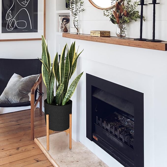 Cotton Rope Plant Basket, Woven Basket Planter for 10 inch Pot, Round Indoor Tree Pot Cover, Small Storage Bin Organizer, Modern Basket for Plants and Home Decor, 11”X11”, Black