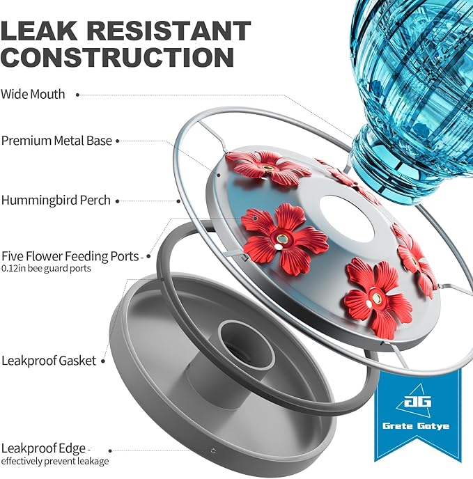 - 💧LEAKPROOF FUNCTION: Built-in durable gasket, unique design makes base connection proper and seamless, even when the hummingbird feeders for outdoors hanging are shaken by wind or birds perching on it. After filling the container and screwing it onto the base, flip it over and hang it on a tree/deck hook/shepherd's hook/hangers/window hook.
