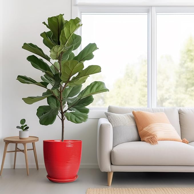 Ceramic Pot for Plants 12 Inch - Plant Pot Indoor with Drainage Hole and Saucer Round Large Planter for Outdoor Plants Mid Century Modern Flower Pot for Home Decor Red