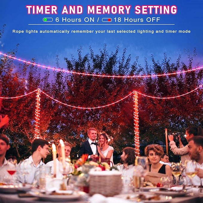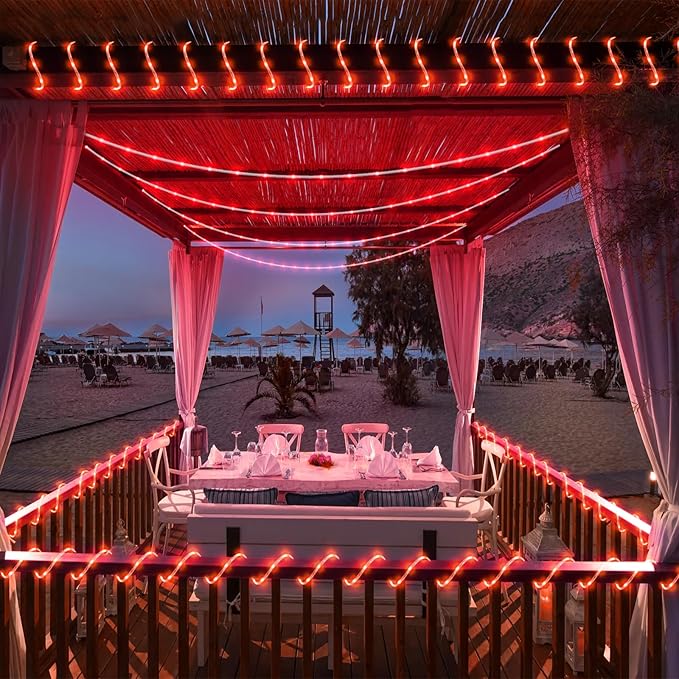 - Waterproof Outdoor String Lights: IP65 Waterproof, they are suitable for all weather use, remaining bright and sparkling even during strong rain and windy days. The outdoor rope lights is ideal for year-round outdoor decor and can illuminate gazebos, canopy, corridors, gardens, and patios. But please note the plug is not waterproof.