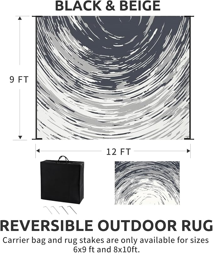 - RV traval&Camping: This camper must haves outdoor rug is ideal for picnics, gatherings, and RV trips! The lightweight outdoor camping carpet with foldable lines is easy to carry and saves space. Includes an extra carry bag and rug stakes for 6x9 ft, 8x10 ft and 9x12 ft. Grass-friendly, durable, and easy to clean, this outdoor rug enhances outdoor adventures.