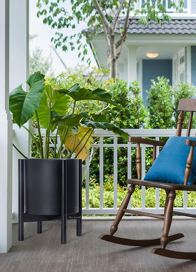 • A Complete Set: Minimalist plastic planter, combined with a sculptural, solid wood stand that match perfectly together and looks great in any home.