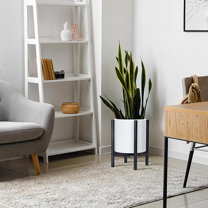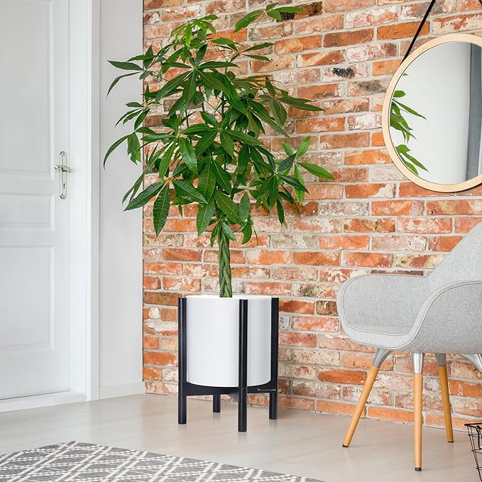 • A Complete Set: Minimalist plastic planter, combined with a sculptural, solid wood stand that match perfectly together and looks great in any home.