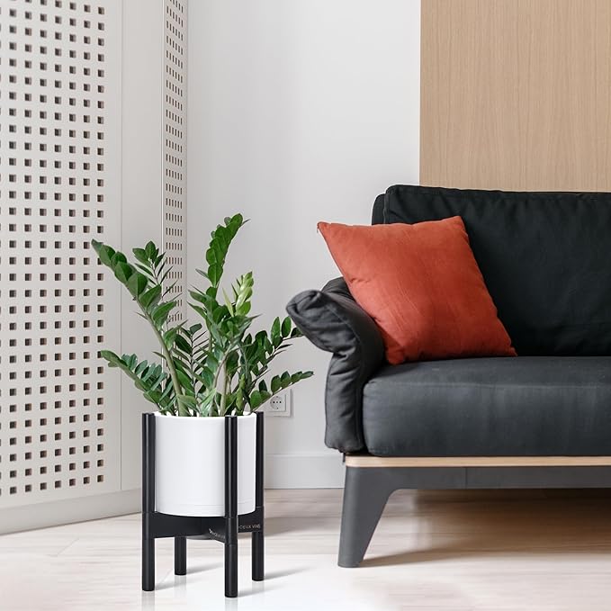 • A Complete Set: Minimalist plastic planter, combined with a sculptural, solid wood stand that match perfectly together and looks great in any home.