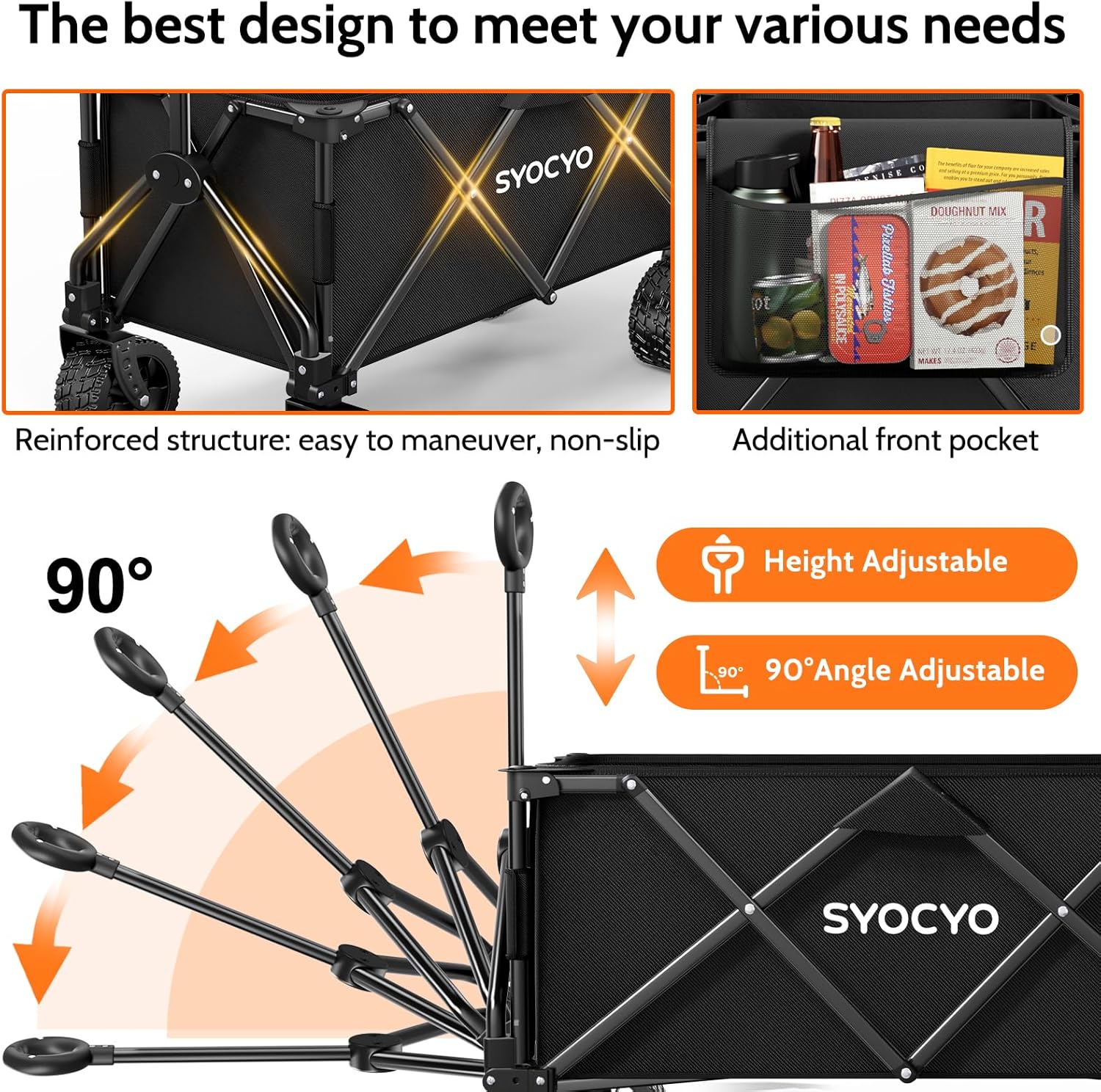 - Adjustable Handle: SYOCYO wagon really did it! Our folding wagon has smoothly rotating, 90Β°adjustable handle for making the beach wagon super easy to pull, turn and maneuver, Suitable for people of different body types. The handle locks securely in place, which can effectively control the direction of the folding wagon. Flexible handle could achieve the rebound function and keep it upright. You don't have to bend over to reach the handle
