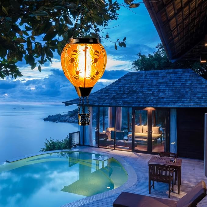 Starsoul Hot Air Balloon Solar Lantern Bee Glass Hanging Outdoor Hot Air Balloon Solar Flickering Flame Light Waterproof Garden Patio Yard Party Decorations