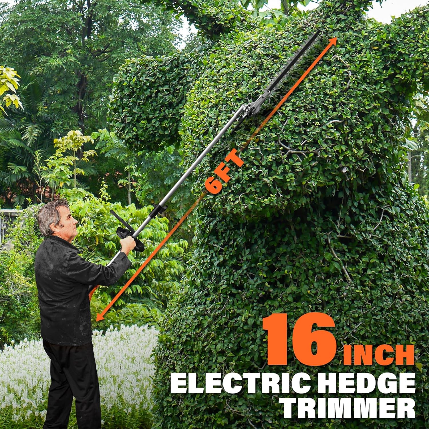 - HEDGE TRIMMER: 16-inch dual-action laser cutting blades provide you with an efficient hedge trimming experience, allowing you to trim high branches with ease. The blades are adjustable from 0-180 degrees to meet the needs of trimming branches at different angles.