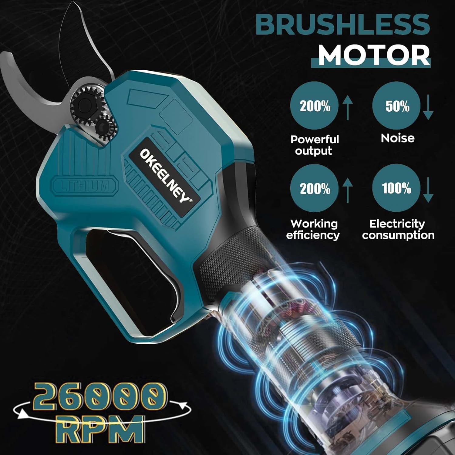 - 【Brushless Motor & Swiss SK5 carbon steel blade】Okeelney cordless Pruner integrates Swiss-grade SK5 high-carbon steel blades with corrosion-resistant non-stick coating and a high-torque brushless motor system, delivering precision cutting capacity up to 1.5inch branch diameter while ensuring zero jam operation and extended durability