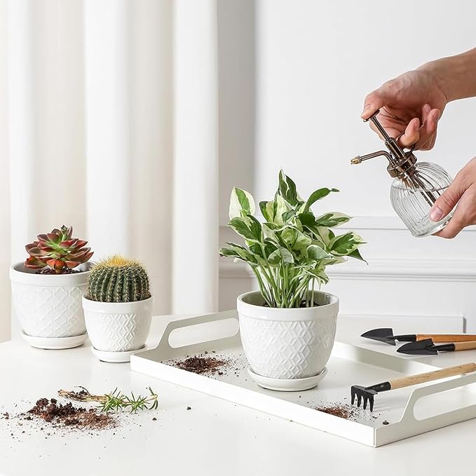 - Minimalist Design of Houseplant Pot: These indoor planters are designed with four different embossed patterns that make it easy to mix and match plants to create a elegant look, decorating windowsill, tabletop, shelve, kitchen, living room, bedroom, office, garden and patio. These flowerpots have a minimalist design and combination solid color glaze that blend seamlessly with a various of home styles