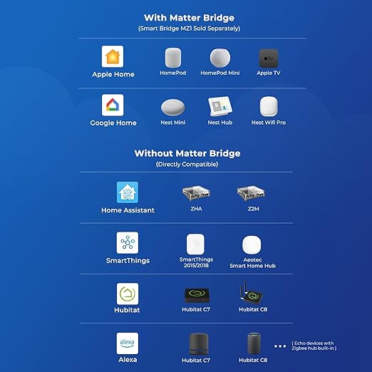 - Zigbee Standard Compatible:Works with compatible Zigbee hubs or Echo devices with Zigbee hub built-in, such as Echo (4th Gen), Echo Plus (1st Gen and 2nd Gen), Echo Studio, Eero 6, Eero Pro 6, Home Assistant, SmartThings 2015/2018, Aeotec, Homey, Hubitat, Homey Bridge, Homey Pro and Third Reality Hub, Smart Bridge MZ1, Compatibility is assured for equipment mentioned.For items not listed, their compatibility remains unconfirmed, so we advise proceeding with caution. NOTE: ZigBee Hub is required and sold separately.