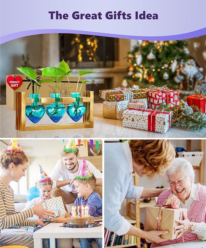 Nacome Plant Terrarium for Office Decor: Wooden Stand Tabletop Planter 3 Bulb Glass Vase Heart Shaped for Hydroponics Indoor Home - Birthday Gifts for Women Mom Grandma
