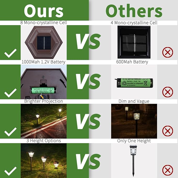 - [UPGRADED SOLAR OUTDOOR LIGHTS]: The solar pathway lights outdoor are equipped with upgraded solar panels, which are more solar powered and have a conversion rate of up to 25%, providing lighting for your garden