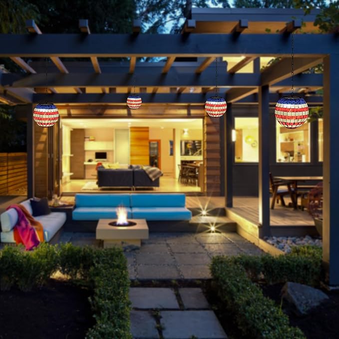 - 【Patriotic Mosaic Design】Each solar hanging lantern is meticulously crafted with high-quality mosaic glass gazing balls, featuring American flag patterns that cast beautiful, warm projections. The sturdy metal chain ensures durability, making these lanterns perfect for enhancing the ambiance of any space, from gardens to patios.
