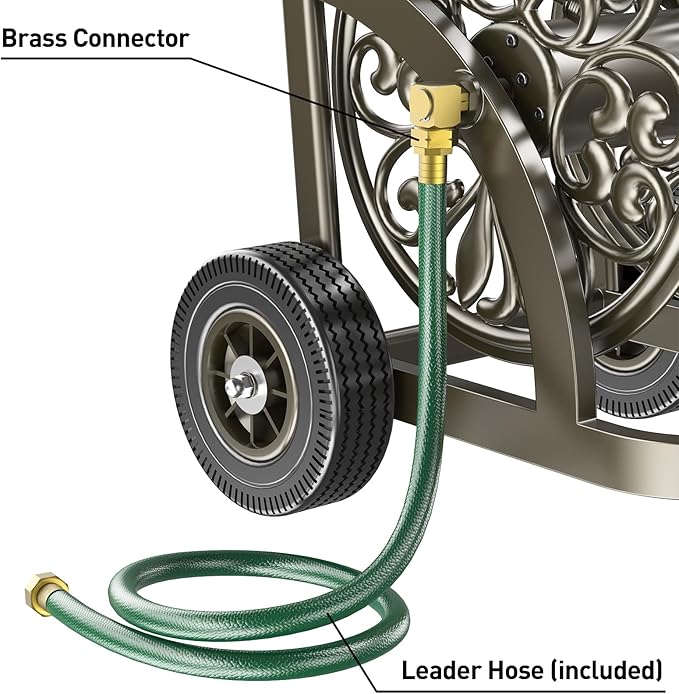 - 【All-weather Construction】Built to withstand all weather, the heavy-duty hose reel cart is constructed with 3 gauge steel, coated with durable powder finish, ensuring the garden hose reel cart has long-lasting performance. The water hose cart is equipped with a solid brass connector, making the garden hose leak-proof.
