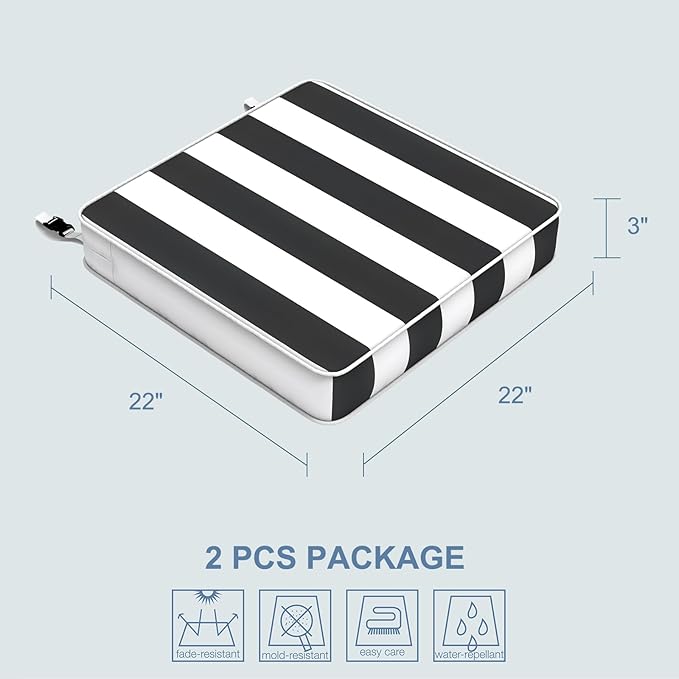 - PACKAGING: Includes 2-Pack outdoor chair cushions 22" x 22" x 3", perfect for patio chairs, garden sofas and more. Due to the vacuum compressed status, please allow 48 hours to restore thickness after opening the package