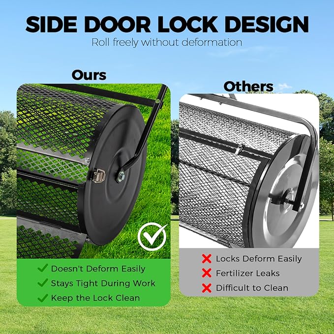 - Easy to Operate: The peat moss spreader is equipped with an upgraded hinge design that allows for a wider opening angle. The hinged soil roller door makes filling easy, while the lawn soil spreader side clasps secure the load