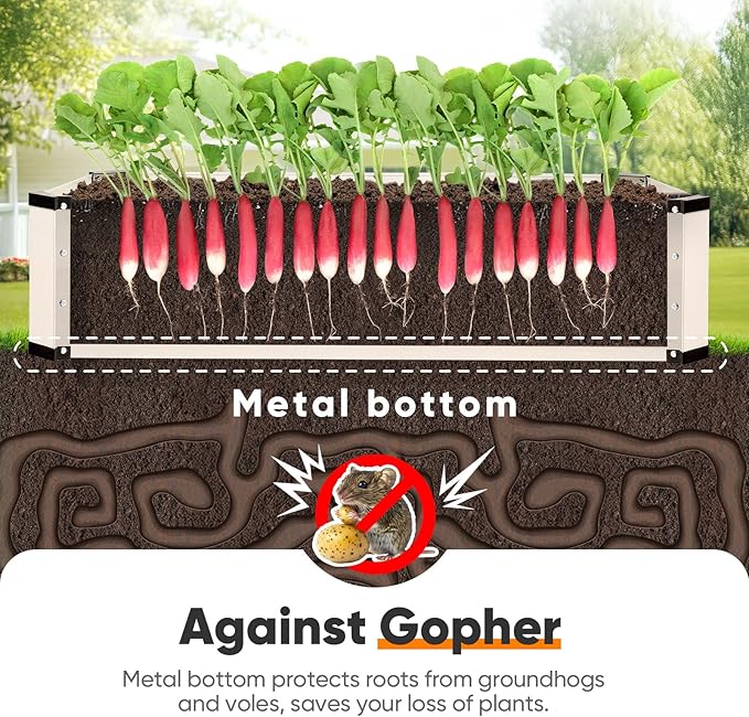- 【No More Vole-Ravaged Crops!】Say goodbye to stolen harvests! Standard raised garden bed kits leave roots exposed to burrowing animal, but our galvanized steel-lined base acts as a 24/7 rodent barrier. No DIY wire mesh needed - just assemble and plant. Ideal for organic vegetable enthusiasts in rural/suburban areas where voles there destroy a large amount of crops every year. Protect your heirloom carrots and beetroots effortlessly!