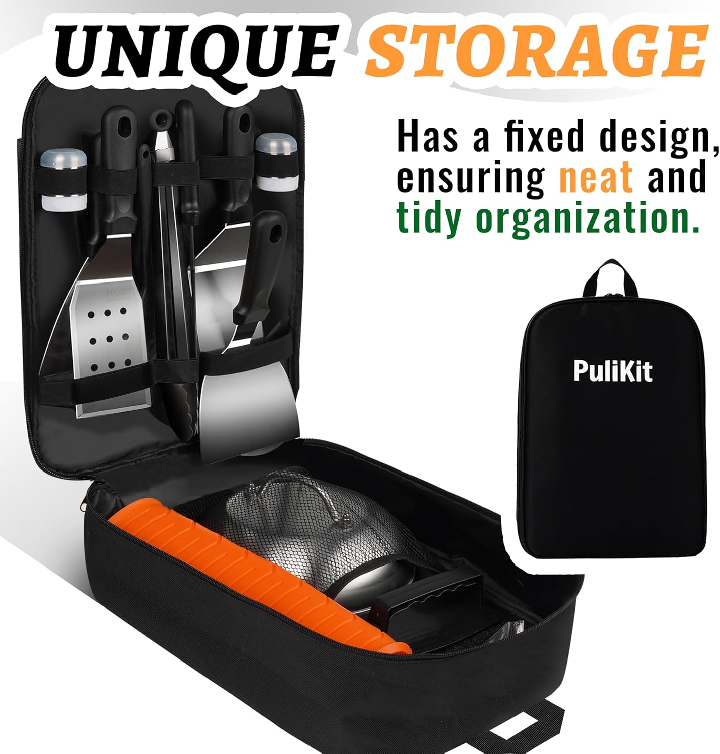 - Universal Compatibility & Space-Saving Design: Works seamlessly with Blackstone 28"/36" griddles, Camp Chef FTG models, and most outdoor flat tops. Compact fold able tools + vertical bag storage save 50% space vs traditional kits. Bonus silicone hook lets you hang essentials mid-cook.