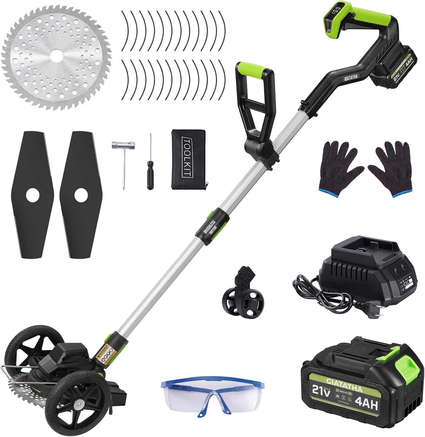 Electric Weed Wacker Cordless with Wheel, Brushless Grass Trimmer with 21V 4.0Ah Battery and Fast Charger, 3 Types of Blades String Trimmer, Weed Eater Battery Powered, Grass Cutter Machine