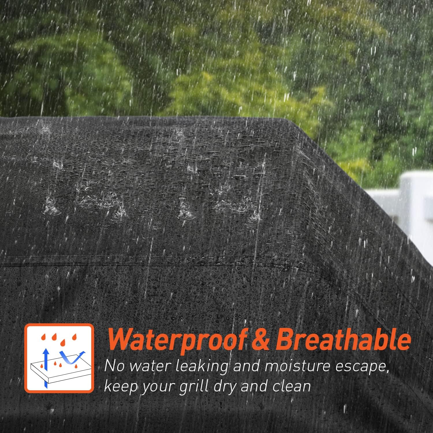 - 【Waterproof and Breathable Material】Made of waterproof and breathable 420D polyester fabric with PU backing, prevents water from seeping in and allows moisture to escape, keeping your outdoor grill dry and clean. The outdoor grill cover is also easy to put on and take off, will not stick to your grill in hot weather.
