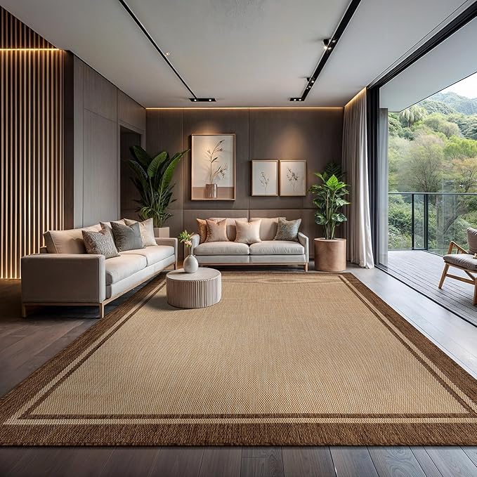 CAMILSON Indoor Outdoor Rug, 10x14 Bordered Natural Brown Modern Large Area Rugs for Indoor and Outdoor Patios, Kitchen and Hallway Mats, Washable Porch Deck Outside Carpet (Jute, 10 x 14)