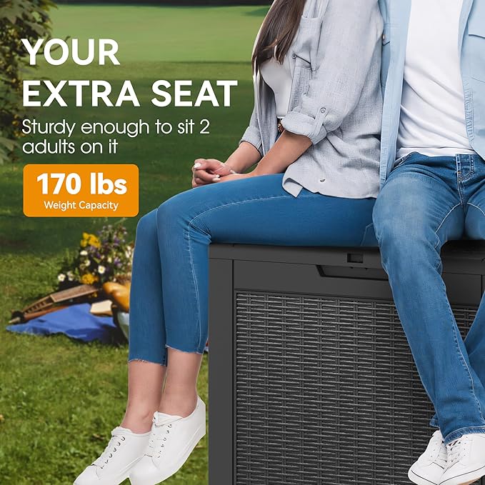 - đïžăHIGH QUALITY MATERIALăThis outdoor storage bin is made of high-density PP resin with excellent waterproof, sunproof and dustproof performance to withstand all kinds of harsh weather, while the rattan-like texture surface design adds a modern touch to your outdoor space.