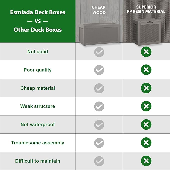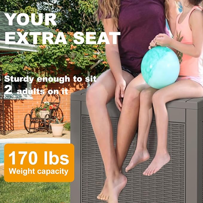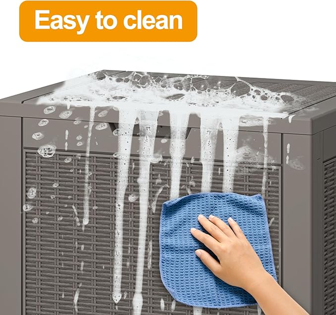 - đïžăHIGH QUALITY MATERIALăThis outdoor storage bin is made of high-density PP resin with excellent waterproof, sunproof and dustproof performance to withstand all kinds of harsh weather, while the rattan-like texture surface design adds a modern touch to your outdoor space.