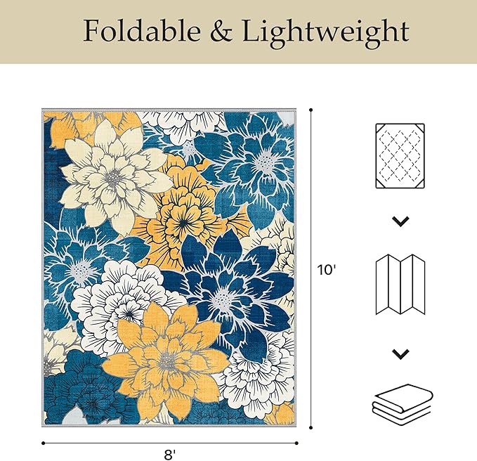 GENIMO Indoor Outdoor Area Rug 8' X 10' Waterproof, Washable Patio Rug Non Shedding, Easy Cleaning Floral Outdoor Carpet for Living Room, Bedroom, Dining Room, Balcony, Backyard, Deck, RV, Blue