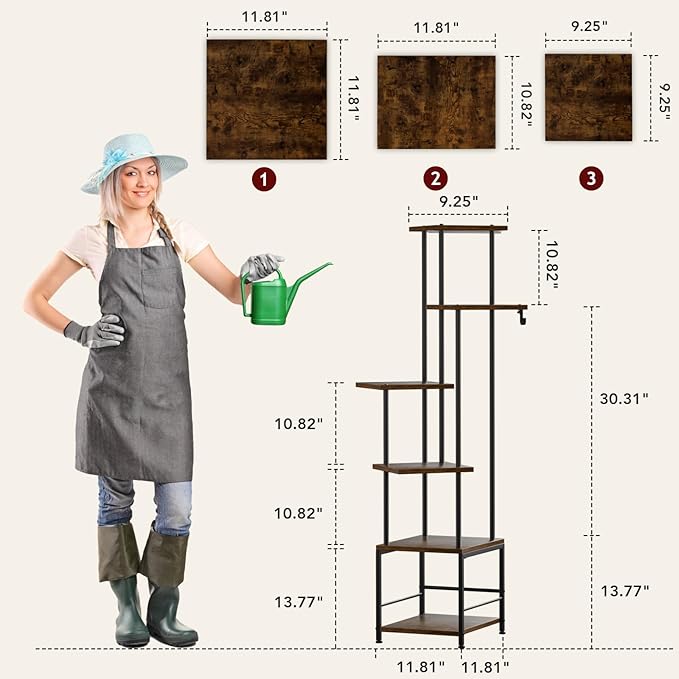- [Heavy-Duty Design] Built with heavy-duty iron pipes and waterproof walnut shelves, this tiered plant stand indoor is designed to withstand the elements and provide long-lasting support for your favorite plants. The thickened boards are treated with a waterproof layer to prevent warping, curling, or water damage, making it perfect for both indoor and outdoor use. It’s a durable, elegant solution for those looking to enhance their spaces with indoor plant shelf and flower stands for indoor plants