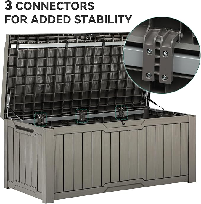 - Thoughtul Details: Our deck storage box offers side handles for effortless lifting, a lockable lid for added security (lock not included), and hydraulic struts to prevent abrupt lid closure, prioritizing user safety