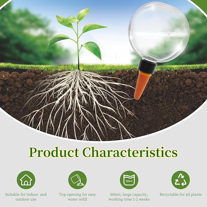 - 【No effort and no time】:practical and efficient solutions for busy plant lovers;You don't need to remember when to water your plants, just check the water balloons 1-2 times a week; The large capacity of 17.5 oz / 500 ml saves you the time and effort of frequent refills.