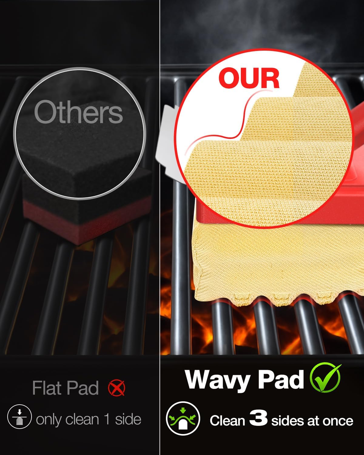 - 【2 Grill Replacement Heads】: Grill cleaning kit includes 1 handle and 2 replaceable brush heads (aramid fiber and steel fiber). The aramid fiber can withstand high temperatures up to 450°F, suitable for steam cleaning, while the bottom wave design fits the round grill more efficiently; steel fiber can effectively remove stubborn dirt.