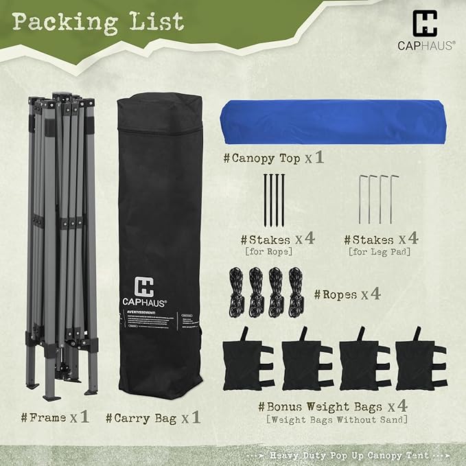 - All-Inclusive with Bonus Accessories - Our canopy set includes 4 weight bags, 4 pegs, 4 ropes, and 4 stakes for stability; the carry bag makes transportation easy; note: weight bags are not pre-filled and should be filled before use for stability