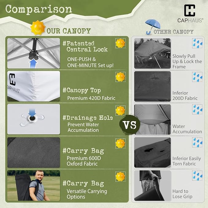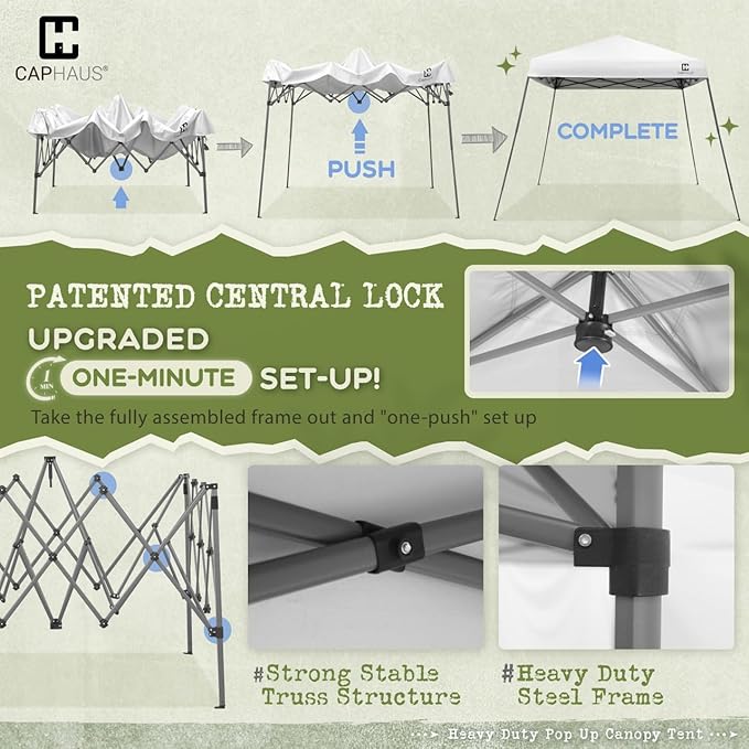 - Patented One-Push Set Up – Our EZ Up Canopy features a patented One-Push Set Up for easy assembly; with a single push, the center lock secures all four legs, while pinch-free buttons allow simple height adjustments from 4ft 11” to 6ft 2”