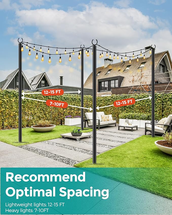 - Optimal Pole Spacing for Perfect Lighting: Designed for optimal light distribution, these light poles for outside are spaced 12-15 feet apart for lightweight lights and 7-10 feet apart for heavy-duty lights. This ensures the string light poles remain straight and provide an outstanding lighting display for any occasion