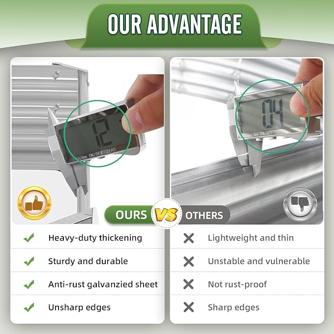 - BUILT TO LAST:THE garden bed is treated to withstand everyday wear and tear due to its 0.6mm thick, galvanized metal sheets and a highly durable zinc coating. Our prime materials ensure the garden bed is sturdy and maintains its shape over time. From heavy rain to extreme heat, we made sure to protect your garden bed from rust and corrosion, so it's the perfect choice if you're looking for a long-lasting solution.