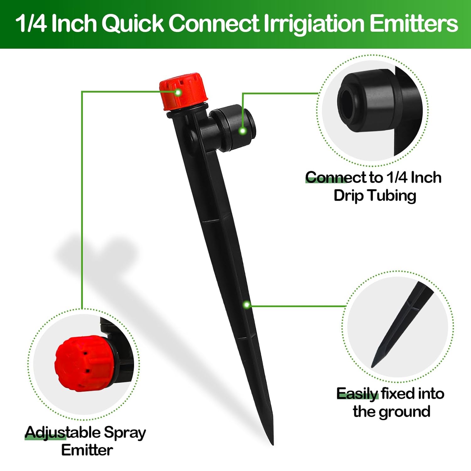 - Universal Compatibility: Our quick connect drip irrigation emitters fit seamlessly with all types of 1/4" irrigation tubing, ensuring a smooth and hassle-free installation. Designed for your convenience, our drip irrigation sprinkler heads feature a one-touch pull-out function, making it incredibly easy to install, remove, or reposition the tubing without any tools or excessive force. Plus, our detachable irrigation emitters are straightforward to clean, ensuring maintenance is a breeze and your system remains in top condition