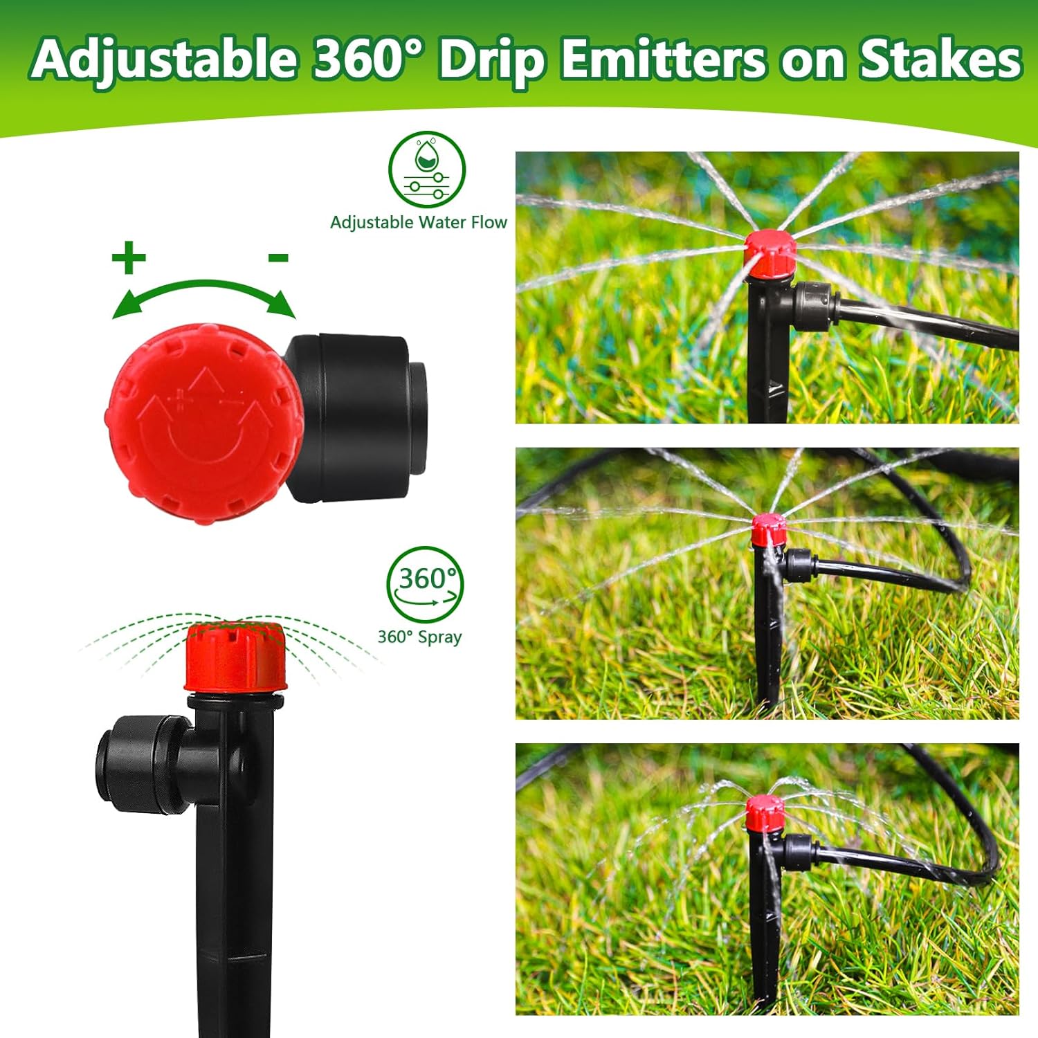 - Adjustable Water Flow: Gain total control over your irrigation with our adjustable flow 1/4" drip 360 sprayer. Easily switch from fine droplets to a steady stream, adjusting the spray diameter up to 10 feet to meet the specific needs of every plant in your garden. And when watering isn’t needed, you can effortlessly turn them off to conserve water