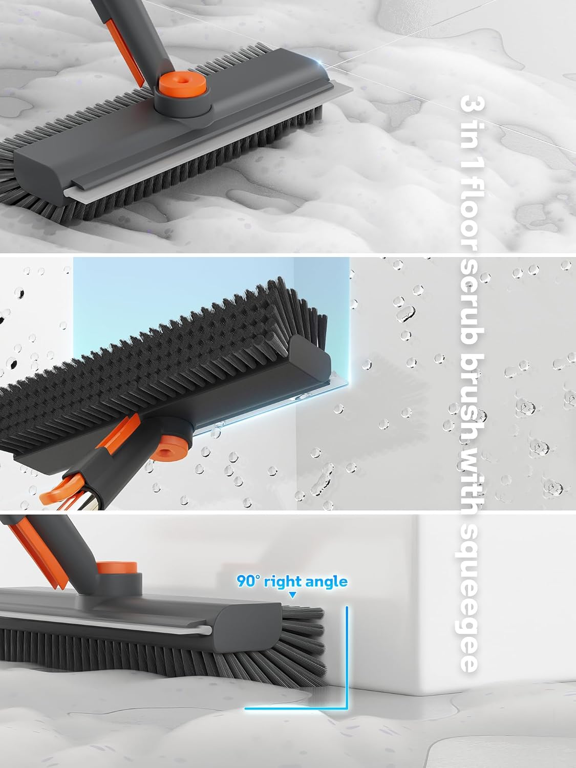 - ใ3-in-1 Versatile Floor Scrub Brushใ: Our Floor scrubber is equipped with hard bristles for scrubbing, a rubber Squeegee for Scraping sewage, and tweezers to remove hair or debris. Itโs the ideal scrub brush for cleaning every surface in your home, just one 3 in 1 cleaning brush for a spotless home