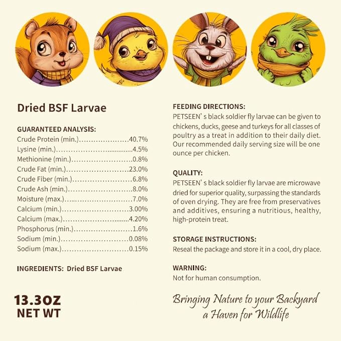 • Nutritious Treat: Packed with protein, these larvae make a healthy and delicious treat for layer hens, wild birds, and ducks.