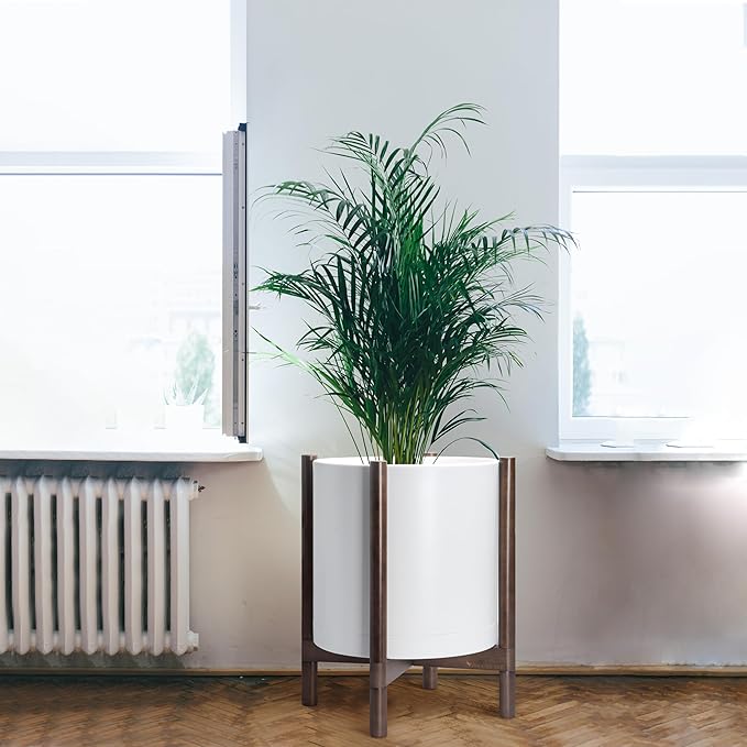 • A Complete Set: Minimalist plastic planter, combined with a sculptural, solid wood stand that match perfectly together and looks great in any home.