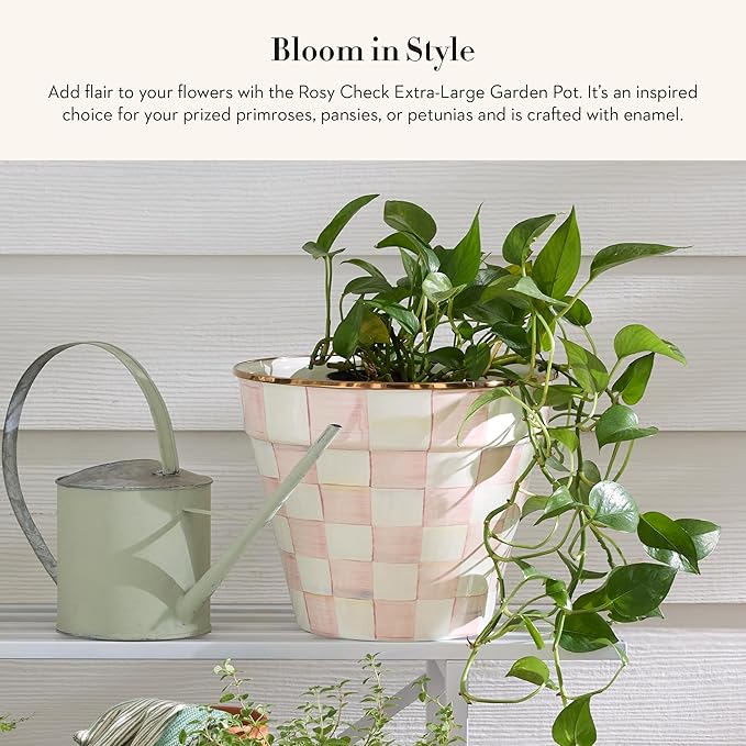 MACKENZIE-CHILDS Enamel Garden Pot, Decorative Pot for Plants, Outdoor Flowerpot Decor, Extra Large, Pink-and-White Rosy Check