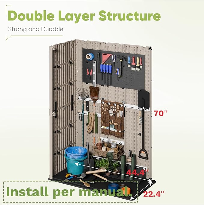 - Large storage space: With 50 cubic feet of space, you can meet your daily storage needs. The storage cabinets can store everyday gardening tools for your yard such as weed whackers, as well as other indoor and outdoor equipment such as couch cushions, sports equipment, and more