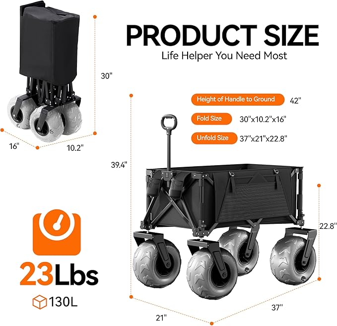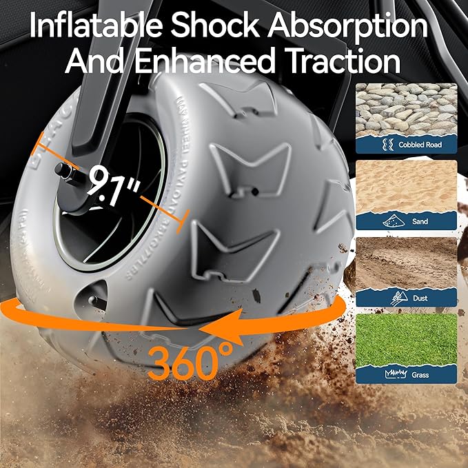 • All-Terrain Mastery | Sand/Grass/Gravel Ready: 10-inch extra-wide puncture-proof tires + dual ball bearings, effortlessly conquer sand, rocks, and mud (supports 300lbs, 20% more than competitors).