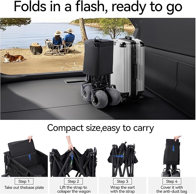 DXZ Beach Wagon Cart with Big Wheels for Sand – Folding Collapsible Wagon, Heavy Duty Wagons Carts Foldable for Beach, Camping, Outdoor Gear, Easy Setup Black Grey